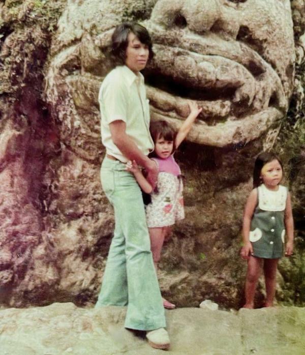 Dia pose bertopang dagu sambil tersenyum tipis, cantiknya sudah terpancar sejak dulu.