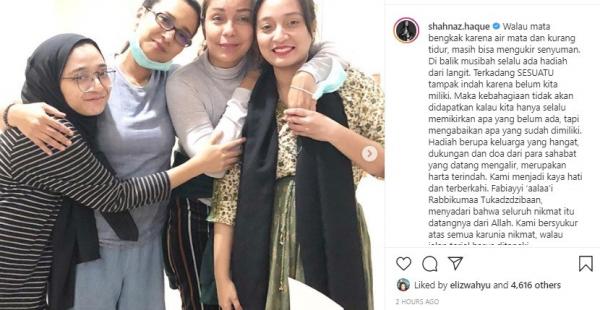 "Mama @sorayahaque, kami ada untuk bersama melewati ujian ini. Kamu isteri yang telah menjadi pakaian indah untuk sang suami. Apakah kalian akan menua bersama, biarkan itu menjadi rahasia milik Sang Penguasa. Mari tegar menjalani episode yang ini. Walau terseok, tapi kami ada untuk menjadi penyangga kalian agar menjadi kuat," tulis Syahnaz, seperti dikutip dari Instagram, Minggu (19/1/2020).