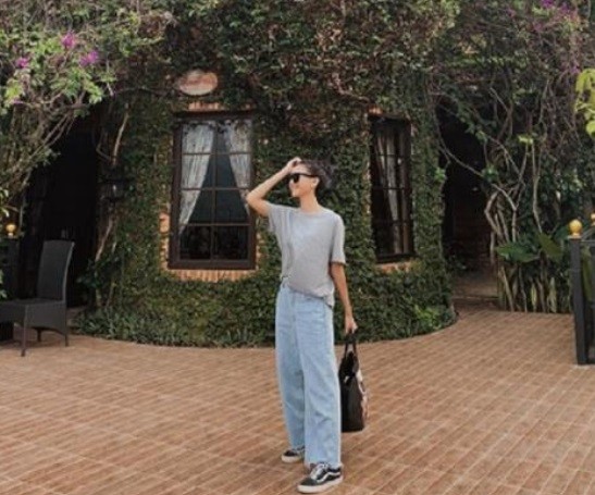 Tak hanya itu, dia juga memadukan kaus tersebut dengan celana panjang jeans wide leg supaya makin terkesan oversize. Tak lupa, dia juga membawa tote bag, mengenakan kacamata dan sepatu sebagai penyempurna penampilan.