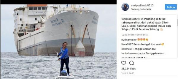 “Paddling di teluk sabang melihat dari dekat kapal Silver Sea 2. Kapal hasil tangkapan TNI AL dan Satgas 115 di Perairan Sabang,” tulis Susi di akun resmi Instagramnya @susipudjiastuti115, seperti dikutip iNews.id, Minggu (3/12/2017).