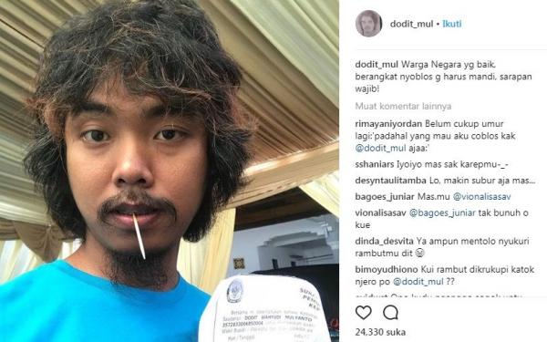 Kelakuan komedian ini mengundang tawa para netizen yang tergelitik untuk memberikan komen. Terlebih Dodit mem-posting-kan foto seolah habis makan dengan tusuk gigi masih digigitnya.