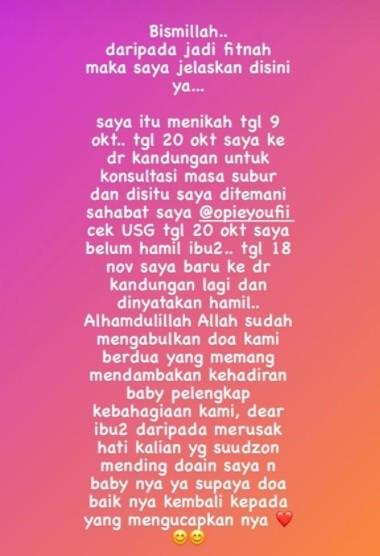 “Cek USG tanggal 20 Oktober saya belum hamil ibu-ibu. Tanggal 18 November saya baru ke dokter kandungan lagi dan dinyatakan hamil,” tulisnya lagi.