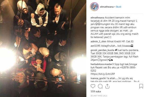Dalam instagramnya, Elma menceritakan kejadian yang mendebarkan ini. Saat kejadian tersebut ada 20 orang dalam satu lift dan oksigen di dalam pun mulai menipis.