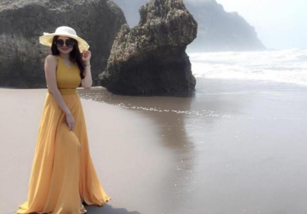 Busana cerah dan pantai adalah satu paduan yang serasi. Seperti yang dikenakan Aldira saat berfoto di pinggir pantai. Dia mengenakan gaun panjang tanpa lengan warna kuning emas. Tak lupa juga dipadankan dengan kacamata hitam, serta topi pantai.