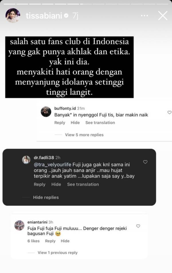 Sebelumnya, Tissa juga melakukan hal serupa. Dia merasa geram dengan perlakukan penggemar Fuji kepadanya. Hal itu terlihat dalam komentarnya di sebuah video TikTok, di mana Tissa kesal saat fans Fuji membandingkan gaya hingga fisiknya yang disebut mengikuti sang idola.