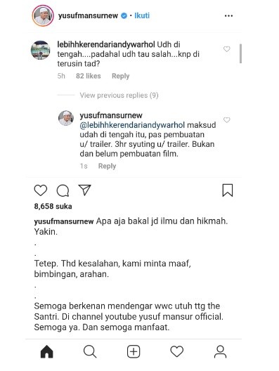 Dia juga meminta maaf apabila film yang dibintangi putrinya tersebut mengandung unsur kesalahan. "Apa aja bakal jd ilmu dan hikmah. Yakin. Tetep. Thd kesalahan, kami minta maaf, bimbingan, arahan," tulis dia.