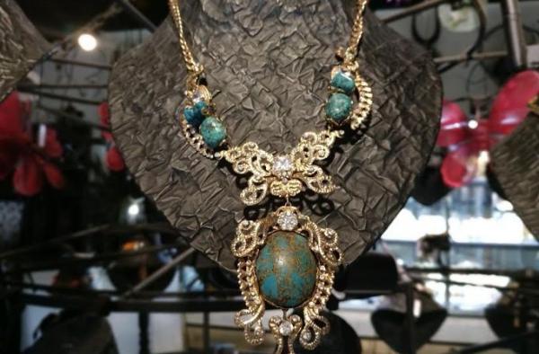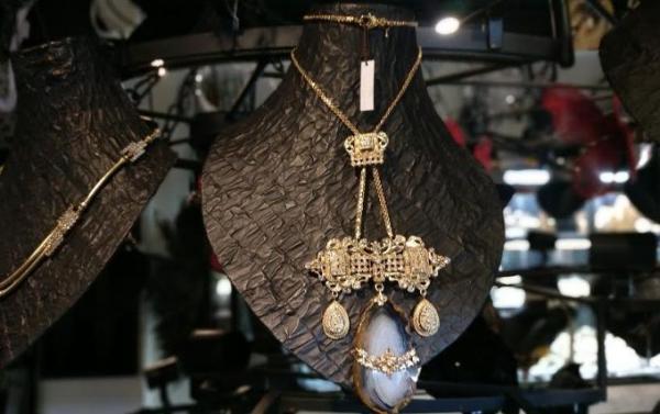 Dia memperlihatkan contoh karya-karya aksesori dan perhiasan yang menjadi tren 2019 ala Rinaldy Yunardi. Tampak penggabungan unsur Eropa dan tradisional Jawa berpadu dalam perhiasan yang dibuat dari batu-batu alam menjadi perhiasan ala zaman kerajaan.