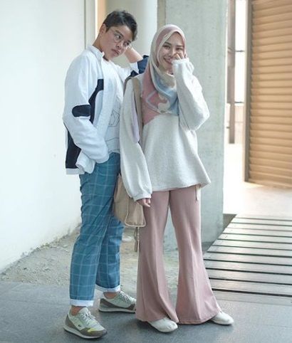 Jika Anda lebih menyukai gaya yang simple namun tetap nyaman dan sopan dikenakan untuk momen spesial di Idul Adha, cobalah gaya Zaskia Adya Mecca ini yang memadukan atasan blouse putih dengan celana kulot berwarna merah muda. Padukan penampilan polos itu dengan kerudung bercorak yang bikin penampilan lebih berwarna.