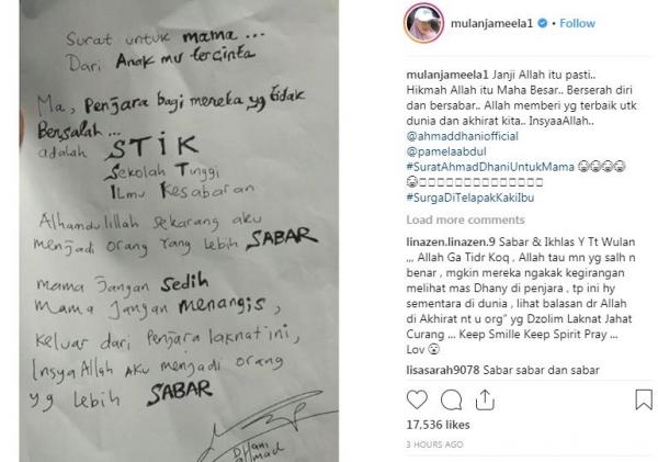 "Surat untuk mama... Dari anakmu tercinta. Ma, penjara bagi mereka yg tidak bersalah... Adalah STIK, Sekolah Tinggi Ilmu Kesabaran. Alhamdulillah sekarang aku menjadi orang yang lebih sabar," tulisnya seperti dikutip dari surat yang diunggah di akun Instagram Mulan Jameela, Kamis (14/2/2019).