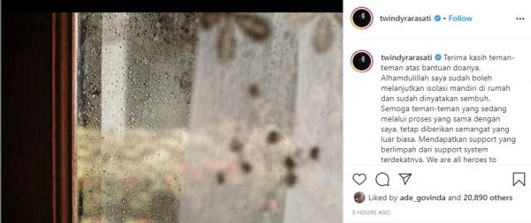 “Terima kasih teman-teman atas bantuan doanya. Alhamdulillah saya sudah boleh melanjutkan isolasi mandiri di rumah dan sudah dinyatakan sembuh. Semoga teman-teman yang sedang melalui proses yang sama dengan saya, tetap diberikan semangat yang luar biasa,” tulis Twindy di Instagram, dikutip iNews.id pada Sabtu (2/5/2020).