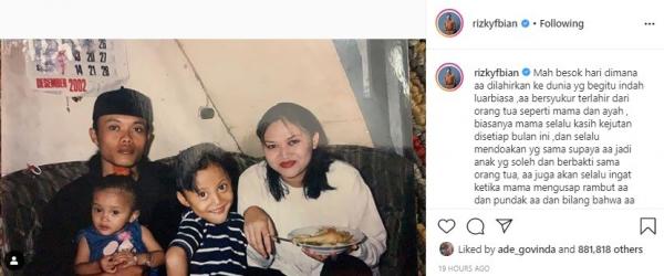 Rizky juga menuliskan kalimat rindu dan doa pada almarhumah ibunda. “Mah aa sayang mama, semoga mama tenang disana, aa selalu mendoakan disetiap sujud aa, agar mama tau betapa aa menyayangi mama, aa hanya ingin mengucapkan aa rindu mama,” tulis Rizky.