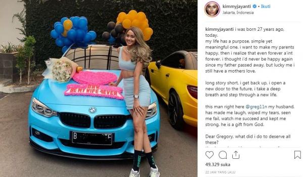 "My bday gift, how sweet BMW 'Be my Wife Forever.' I will i will!!!" tulis Kimmy di Insta Story miliknya, seperti iNews.id kutip, Jumat (19/10/2018).