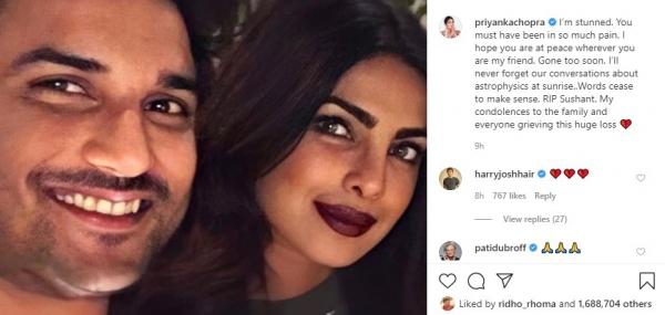 Hal yang sama juga diungkapkan Priyanka Chopra di media sosial Instagramnya. “Aku tertegun. Kamu pasti pernah menderita. Kuharap kamu damai di mana pun kamu berada, sahabatku. Kamu pergi terlalu cepat,” tulis Priyanka.