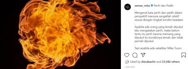 “Mengenal kata perih dan pedih dalam perspektif manusia sangatlah relatif sesuai dengan tingkat kondisi keadaan. Apabila ada orang yang lemah dipukul lalu mengatakan perih, maka belum tentu itu perih karena memang yang dipukul itu kondisinya lemah dan tidak pernah dipukul,” tulis Ustaz Oemar Mita dalam akun Instagramya, dikutip iNews.id pada Selasa (24/11/2020).