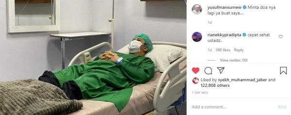 Foto tersebut diunggah di Instagramnya baru-baru ini. Di foto itu, tampak pendakwah 43 tahun tersebut tengah terbaring di tempat tidur rumah sakit mengenakan baju operasi berwarna hijau untuk pasien. Selain itu, juga tampak mengenakan masker.