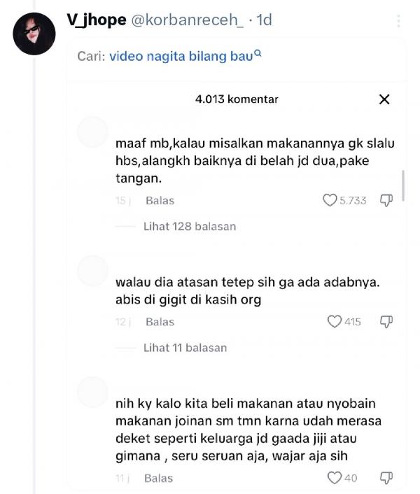 "Walau dia atasan tetep sih ga ada adabnya. abis di gigit di kasih orang," ujar netizen lain.