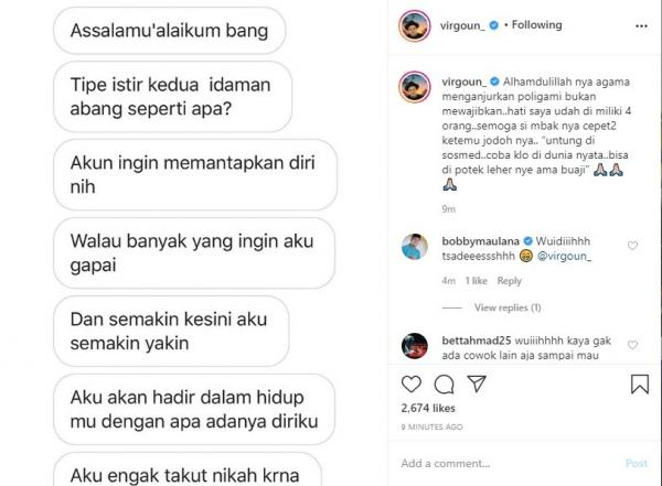 “Alhamdulillah nya agama menganjurkan poligami bukan mewajibkan..hati saya udah di miliki 4 orang,” tulis Virgoun.