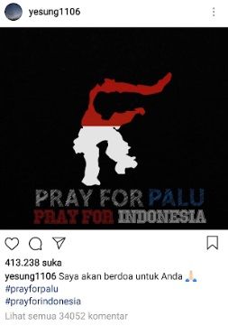 Dalam postingan tersebut, Yesung mengunggah gambar Pulau Sulawesi dan kata-kata bertuliskan Pray For Palu, Pray For Indonesia dengan latar hitam dan pulau yang berwarna merah putih sebagaimana bendera Indonesia.