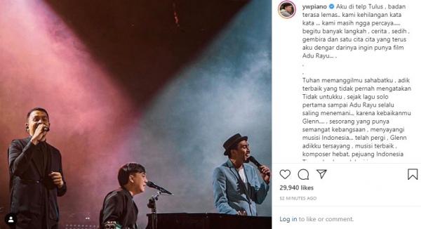 "Aku di telp Tulus, badan terasa Iemas..kami kehilangan kata kata kami masih ngga percaya," tulis Yovie lewat akun Instagram pribadinya @ywpiano, Rabu (7/4/2020).