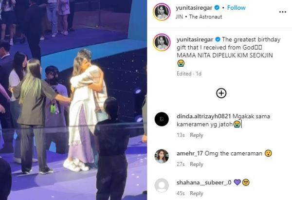 Tak sekadar bertemu, Yunita berkesempatan memeluk Jin dalam salah satu acara yang digelar di Jamsil Indoor Stadium Korea Selatan (Korsel) pada 13 Juni 2024. Momen berharga dibagikan Yunita di Instagram-nya @yunitasiregar.
