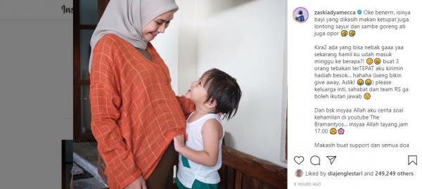 Dalam unggahan foto yang menunjukan dirinya dengan perut membesar tersebut, dia menambahkan keterangan bila mengundang netizen untuk menebak usia kehamilannya. Bahkan, ada hadiah spesial yang akan diberikan.