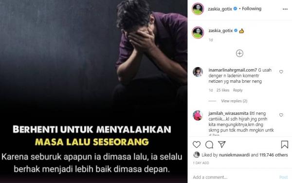 “Setuju banget sama neng @zaskia_gotix karna kita pun sama punya masa lalu dan berhak bahagia di masa depan kita pasti nyaa. sehat selalu ya neng & keluarga,” tulis netizen di kolom komentar.