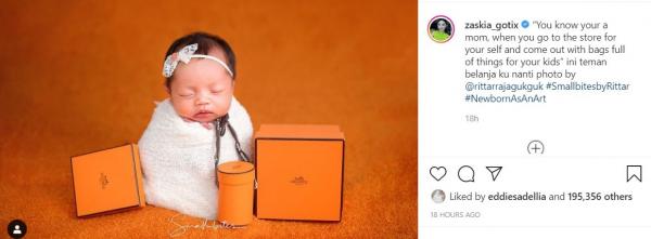 Seperti unggahannya belum ini, di mana sang buah hati yang baru lahir pada November silam, menjalani sesi pemotretan. Dalam foto tersebut, tampak baby Arsila mengenakan bandana cantik dan berpose di samping box Hermes beragam bentuk warna oranye.