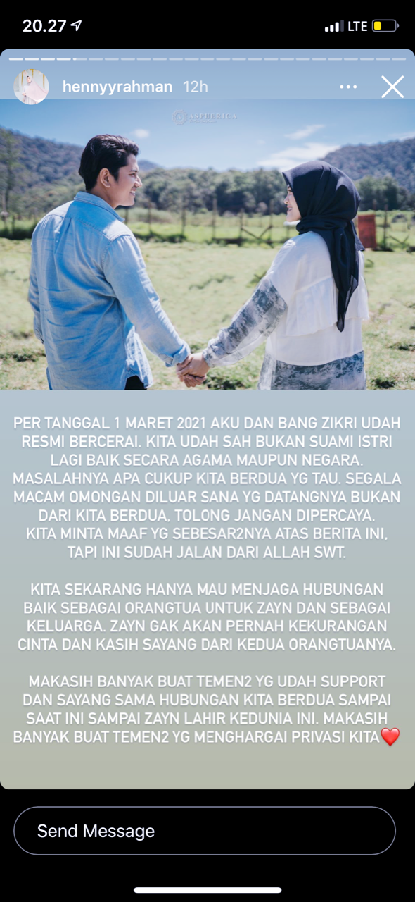 "TAPI INI SUDAH JALAN DARI ALLAH SWT. KITA SEKARANG HANYA MAU MENJAGA HUBUNGAN BAIK SEBAGAI ORANGTUA UNTUK ZAYN DAN SEBAGAI KELUARGA. ZAYN GAK AKAN PERNAH KEKURANGAN CINTA DAN KASIH SAYANG DARI KEDUA ORANGTUANYA," tulis Henny.