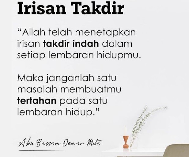 “Allah telah menetapkan irisan takdir indah dalam setiap lembaran hidupmu. Maka janganlah satu masalah membuatmu tertahan pada satu lembaran hidup.”