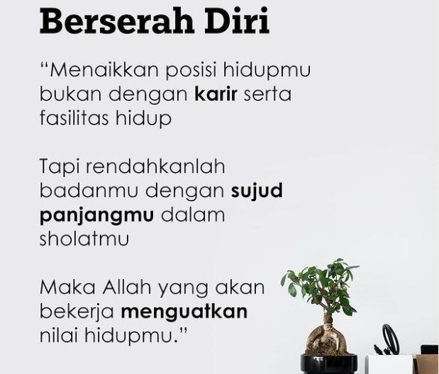 “Menaikkan posisi hidupmu bukan dengan karir serta fasilitas hidup. Tapi rendahkanlah badanmu dengan sujud panjangmu dalam sholatmu. Maka Allah yang akan bekerja menguatkan nilai hidupmu.”