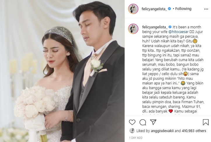 Menutup keterangan fotonya yang panjang, Feli menuliskan ucapan terima kasih yang manis untuk sang suami. “Terimakasih untuk 1 bulan yang indah bo @hitocaesar, sekali dan berbahagia sampai selama-lamanya,” tulisnya.
