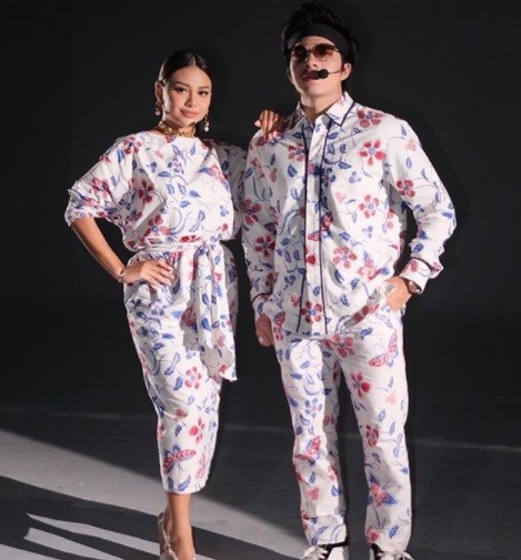 Atta mengenakan setelan kemeja dan celana dengan motif batik. Sementara, Aurel memilih untuk mengenakan dress batik dengan aksen tali yang melingkari pinggangnya.