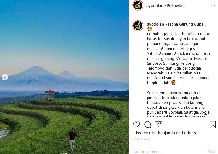 "Pesona Gunung Gupak. Pernah nggak kalian berwisata tanpa harus bersusah payah tapi dapat pemandangan bagus dengan melihat 6 gunung sekaligus. Yah di Gunung Gupak ini kalian bisa melihat Gunung Merbabu, Merapi, Sindoro, Sumbing, Andong, Telomoyo dan juga perbukitan Menoreh. Selain itu kalian bisa menikmati sunrise dan sunset yang begitu indah. Selain tempatnya yang mudah dijangkau terletak di antara jalan tembus Ketep pass dan kopeng, dapat dijangkau dari kota mana pun seperti Boyolali, Salatiga, Jogja, Solo. Lokasi ini bakal jadi tempat alternatif buat para pencinta Camping juga karena disediakan tempat untuk camp. Kuy yang penasaran bisa coba main ke sini," tulis Instaram @ayodolan, dikutip Selasa (23/6/2020).