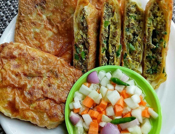 3. Kocok telur dengan sedikit garam, tambahkan isian dan daun bawang, ambil isian sekitar 2 sdm letakkan ke dalam kulit martabak lalu bungkus/lipat seperti amplop, goreng sampai matang kecoklatan, angkat sajikan dengan acar timun wortel.