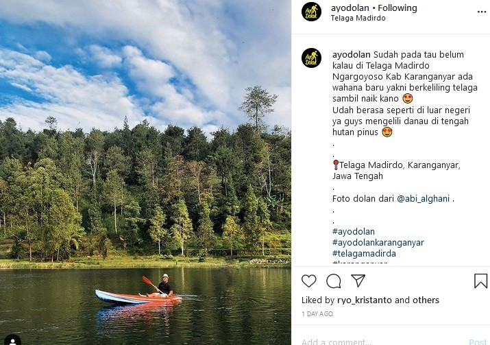 "Sudah pada tahu belum kalau di Telaga Madirdo Ngargoyoso Kab Karanganyar ada wahana baru yakni berkeliling telaga sambil naik kano. Udah berasa seperti di luar negeri ya guys mengelilingi danau di tengah hutan pinus. Telaga Madirdo, Karanganyar, Jawa Tengah. Foto dolan dari @abi_alghani," tulis Instagram @ayodolan, Rabu (17/6/2020).
