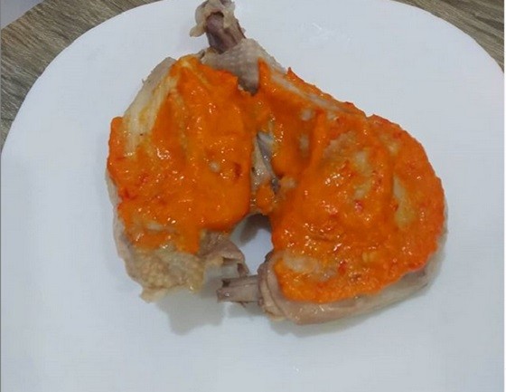 2. Masukan garam & micin, masak sebentar, kemudian blender bumbu sampai halus, tuang di atas ayam, sajikan.