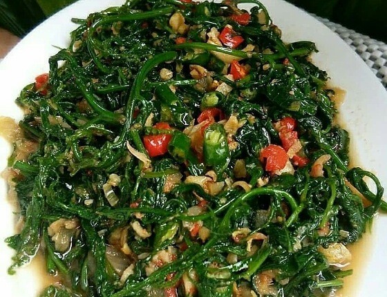 2. Masukkan daun pakis tumis rata, perciki air sedikit jika dirasa kering.