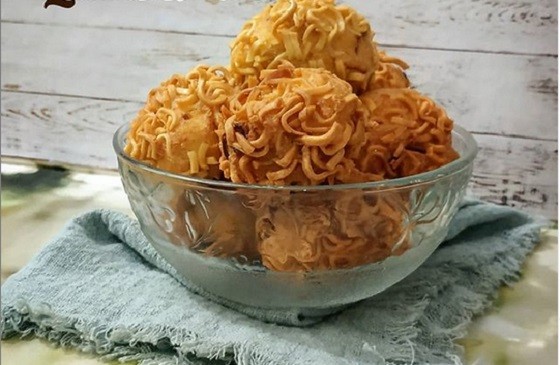 4. Ambil adonan sekitar 1 sdm, bentuk bulat. Gulingkan ke mi yang sudah dihancurkan. Goreng ke dalam minyak panas.
