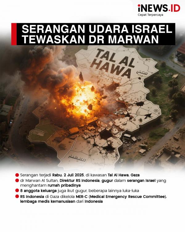 GAZA, iNews.id - Serangan udara Israel kembali memakan korban sipil di Gaza . Kali ini, Direktur Rumah Sakit Indonesia, dr Marwan Al Sultan , tewas bersama delapan anggota keluarganya setelah rumah mereka di kawasan Tal Al Hawa, Gaza barat daya, dihantam pada Rabu (2/7/2025).