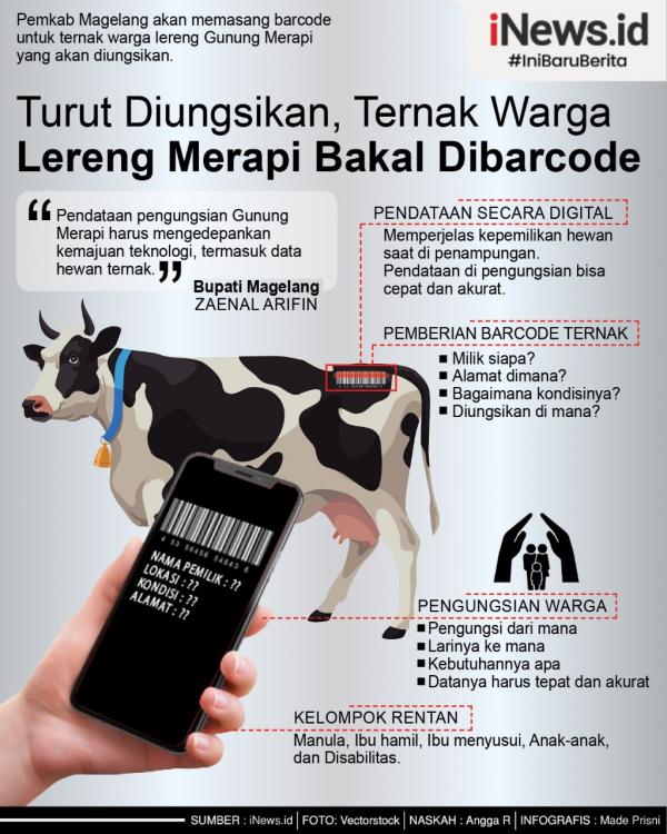 MAGELANG, iNews.id - Pemkab Magelang akan memasang barcode untuk ternak warga lereng Gunung Merapi yang akan diungsikan. Pendataan secara digital untuk memperjelas kepemilikan hewan saat di penampungan.