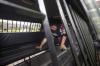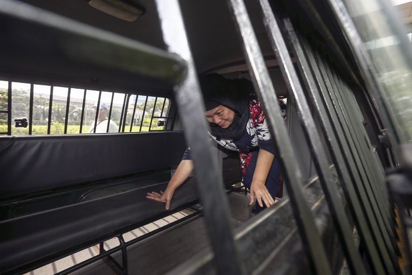 PALEMBANG, iNews.id - Mantan Plt Direktur RSUD Kabupaten OKU Timur, Sumatera Selatan, Dora Djunita Pohan (kanan) melambaikan tangan saat berada di dalam kendaraan tahanan seusai menjalani pemeriksaan di Kejaksaan Tinggi (Kejati) Palembang, Sumatera Selatan, Jumat (23/3/2018).