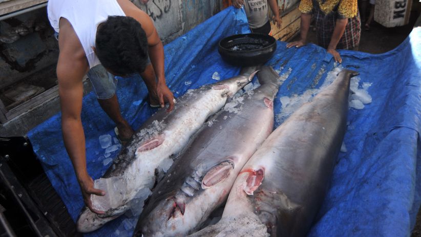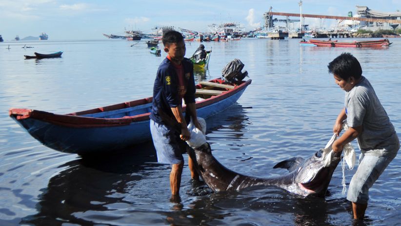 PADANG, iNews.id - Nelayan memindahkan ikan marlin hitam hasil tangkapan kapal bagan mereka, di Pantai Gaung, Padang, Sumatera Barat, Kamis (17/1/2019).
