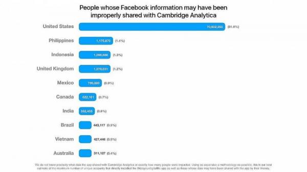 Dengan presentase sebesar 1,3 persen, data sebanyak 1.096.666 pengguna Facebook di Indonesia diberikan ke Cambridge Analytica.