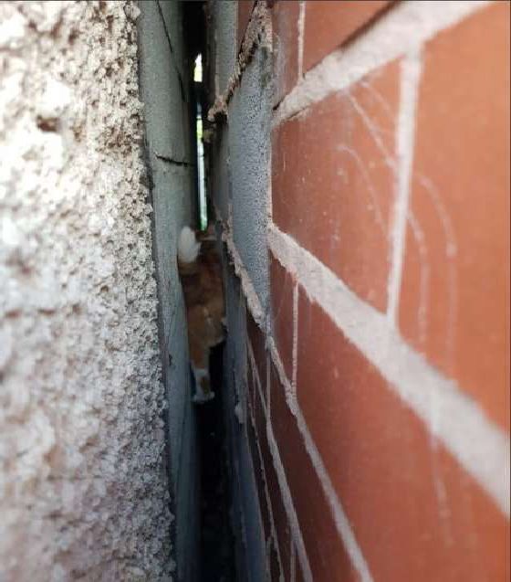 LONDON, iNews.id - Seekor kucing terperangkap di antara dua tembok rumah di Rowley Regis, Inggris. Kucing itu terjepit di antara dua tembok batu bata yang sempit.