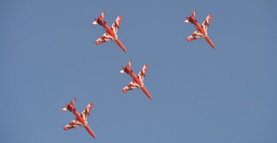 (Atraksi tim aerobatik Surya Kiran saat latihan di Bangalore/Foto: AFP)