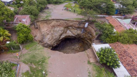 1. Permukaan tanah ambles pada Juli 2018 di Desa pinzon de Morado, Coyuca de Catalan, Negara Bagian Guerrero, Meksiko. Sinkhole dimulai dengan amblesnya lapisan atas tanah yang digunakan sebagai jalan lalu melebar dan semakin dalam.