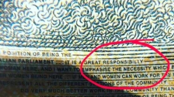 "I stand here today in the unique position of being the first woman in an Australian parliament. It is a great responsibilty," bunyi teks dalam uang kertas pecahan 50 dolar itu.