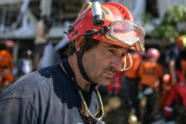 3. Wajah salah seorang anggota LSM Pemadam Kebakaran Darurat Internasional Prancis saat mencari korban di luar hotel Mercure yang hancur di Palu, Sulawesi Tengah.