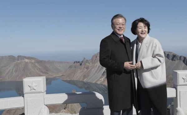 2. Kemesraan Presiden Korea Selatan Moon Jae In dan istrinya Kim Jung Sook di puncak Gunung Paektu. (Foto: AFP)