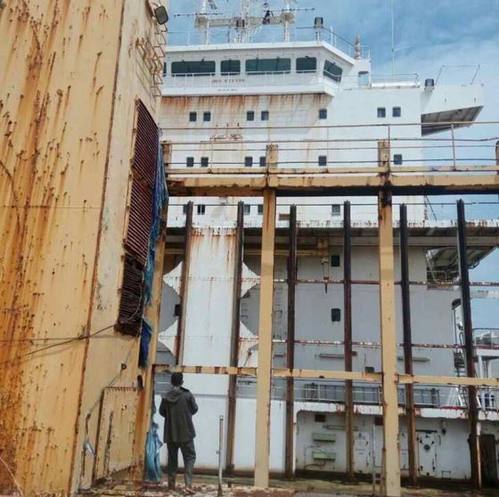 Kapal tampak tak terawat dengan beberapa bagian rusak.